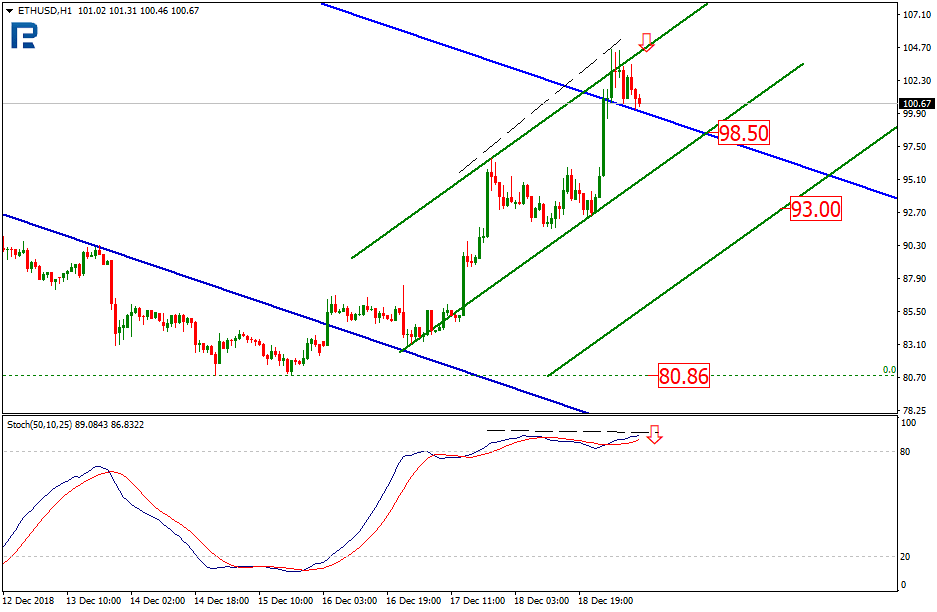 O cronograma horário para o Ethereum demonstra o teste da linha alvo de resistência quebrada do lado de cima. Além disso, a formação de uma divergência no indicador Stochastic, que está sendo observada agora, pode representar uma iminente retração de curto prazo. Seu principal objetivo será o nível de suporte local de US$98,50. A quebra desse nível e a “Cruz Negra” no Stochastic confirmariam essa previsão. O principal objetivo do declínio corretivo será o nível de US$93.