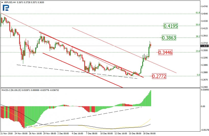 O gráfico de quatro horas para o XRP demonstra talvez um dos mais rápidos impulsos de crescimento corretivo entre as criptomoedas da lista “top”. Após uma convergência no indicador MACD e um teste da linha de resistência do corredor descendente de longo prazo, o mercado optou por não “degustar” a situação favorável por muito tempo e com um poderoso salto superou a distância duas vezes a largura do canal primário, o que é bastante raro.
