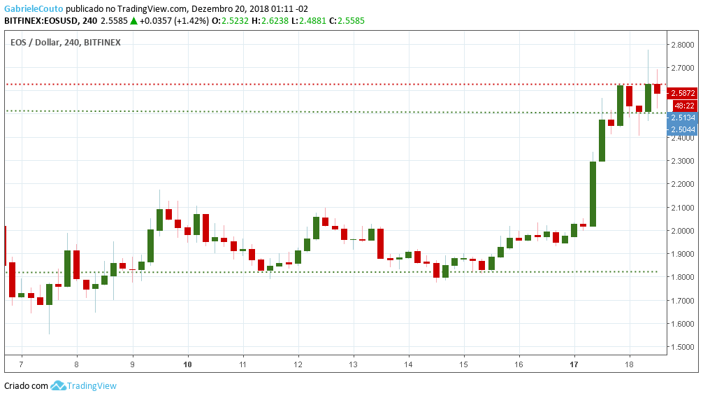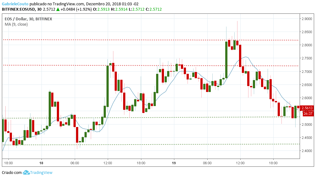Todavia, por mais que a ação aponte uma lateralização do Preço da EOS, em possíveis retornos a níveis mais baixos, os prováveis suportes surgem por volta de US$ 2,56 e US$ 2,42. Mas, se a tendência de alta for realmente confirmada, os preços possivelmente terão facilidade em alcançar níveis de US$ 2,81, nos quais a resistência para a ação deve ser encontrada.