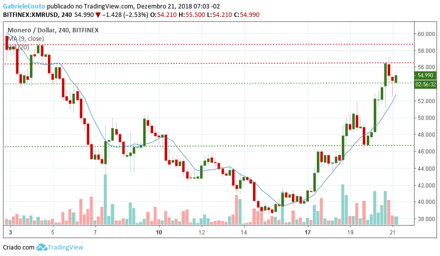 O Preço da Monero iniciou o dia com leve queda, isso porque ao final do dia anterior, a criptomoeda, estava testando uma região de resistência próximo a US$ 57. Contudo, sinais gráficos indicam continuidade da tendência de alta marcada pelos topos e fundos cada vez maiores.
