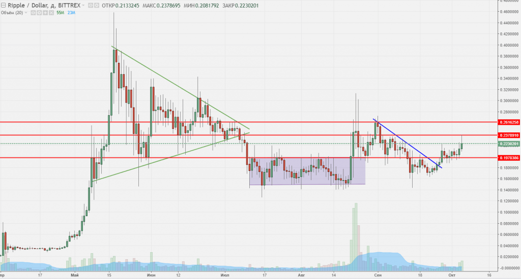 Há também dúvidas de que o aumento dos preços das principais criptomoedas – que ocorre em outubro após uma forte correção no mês passado – pode ser considerado um crescimento estável. Com toda a probabilidade, os movimentos das moedas que foram observados nos últimos dez dias, são meramente de natureza técnica e fundamentalmente não suportados. Dessa forma, acreditamos que mesmo que a linha vermelha de resistência ocorra, no próximo mês, o XRP aumentará para um máximo do pico anterior em US$ 0,28.