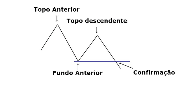 Observe na figura abaixo que há formação de um topo mais alto (topo anterior), seguida por fundo (fundo anterior). A partir de então, o preço para de subir de maneira menos vigorosa e não chega ao mesmo nível do primeiro topo, formando assim um segundo topo, dessa vez menor (topo ascendente). Depois, o preço volta a cair superando a mínima do primeiro fundo (fundo anterior). Quando essa sequência de movimentos acontece, temos a confirmação de um pivô de baixa como é possível observar na figura abaixo.