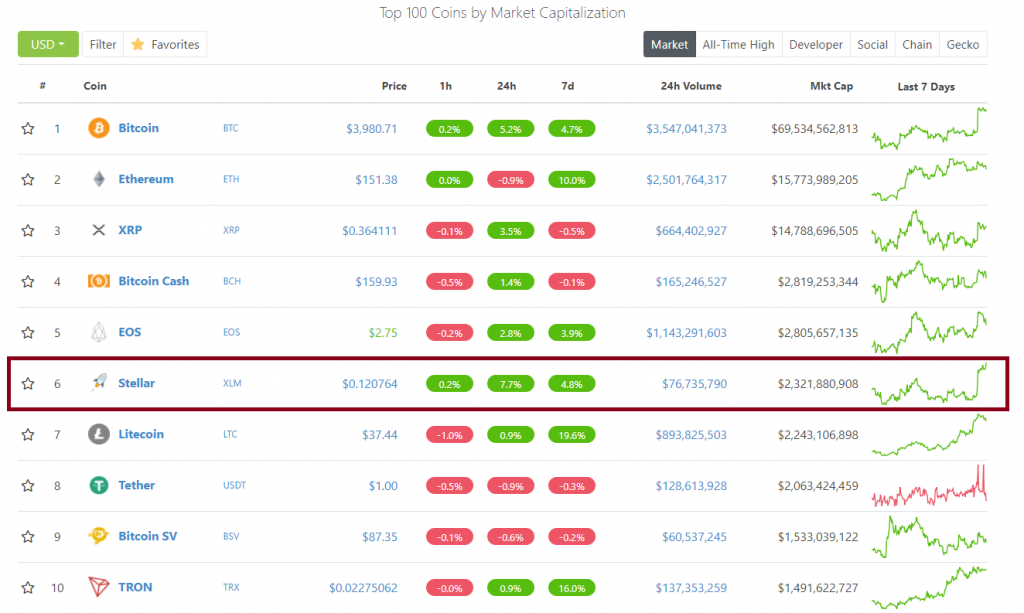 Há também uma melhoria de 2% em relação ao BTC, o que empurra o valor por Stellar Lumens para mais de 3.000 Satoshis. Ganhos sólidos em todas as linhas parecem confirmar que esta tendência de alta é legítima, ao invés de apenas um pump. Esse ganho de valor fez com que a criptomoeda tomasse a 6º no ranking por capitalização de mercado na Coingecko, deixando o Litecoin na 7º posição.