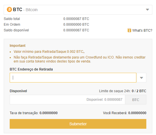 Entre as moedas, selecione a que deseja depositar. BTC é a moeda que possui mais pares de troca e, portanto, é o padrão quando o desejo é de fazer transferências entre uma criptomoeda e outra.
