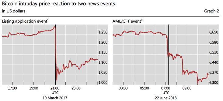 Como exemplo, representantes do BIS citaram a reação do mercado à recusa da SEC em aprovar o pedido dos irmãos Winklevoss sobre a criação de um ETF do Bitcoin. Naquele momento, em poucos minutos, o preço do Bitcoin caiu 16%. Uma reação similar do mercado foi observada no contexto do enrijecimento nas medidas para regular criptomoedas pela Agência de Serviços Financeiros do Japão (FSA) como parte do combate à lavagem de dinheiro.