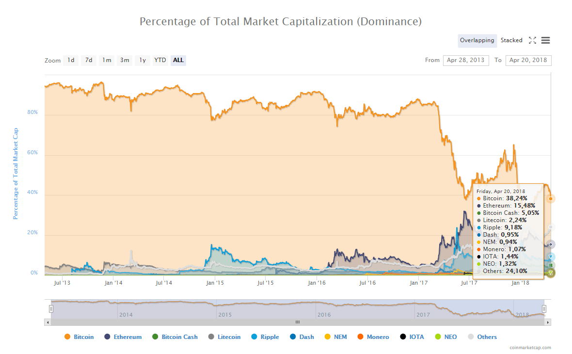 Enquanto a participação do ativo cai em capitalização total do mercado criptomonetário, a participação das altcoins e tokens sobe em um ritmo bastante acelerado.