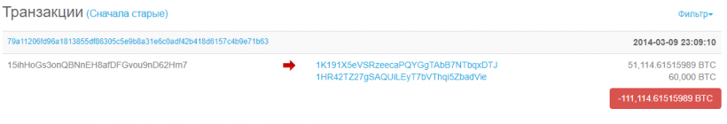 Em 9 de março de 2014, foi realizada uma transação para o endereço 15ihHoGs3onQBNnEH8afDFGvou9nD62Hm7, no valor de 111.114,61515989 BTC. No mesmo dia, os fundos foram enviados para dois diferentes endereços em duas parcelas de 51.114,61515989 BTC e 60 mil BTC, respectivamente.