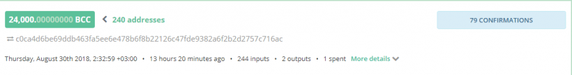 Assume-se que o endereço 1PaXGqu7oJ3n9hc3d4ExxeRZpbhFfwKUHZ pertence ao mesmo proprietário ou grupo de pessoas que colocaram dezenas de endereços de Bitcoin em movimento. No momento, cada um de 240 endereços já transferiram 100 BCH para o endereço acima, o que totaliza 24 mil BCH.