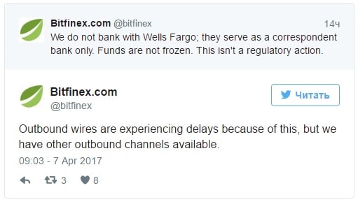 A corretora de Bitcoin Bitfinex já apresentou uma explicação, afirmando que a Wells Fargo atua exclusivamente como um banco correspondente, e que não se trata de um bloqueio de fundos.