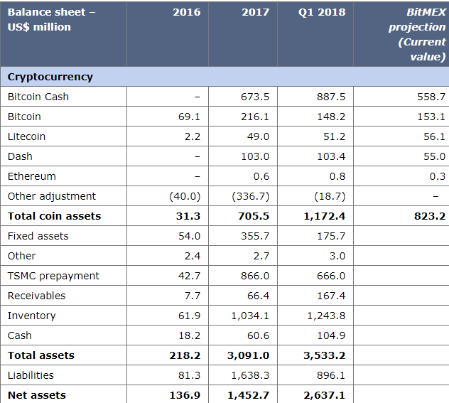 A Bitmain não tem dívidas, mas um adiantamento de US$866 milhões para o fabricante de chips TSMC em 2017 afetou bastante os ativos operacionais. Além disso, a empresa não vendeu mercadorias (mineradoras) por um valor de US$ 1,2 bilhão, o que indica uma enorme superprodução, e investiu significativos fundos para em altcoins (mais de US$1 bilhão).