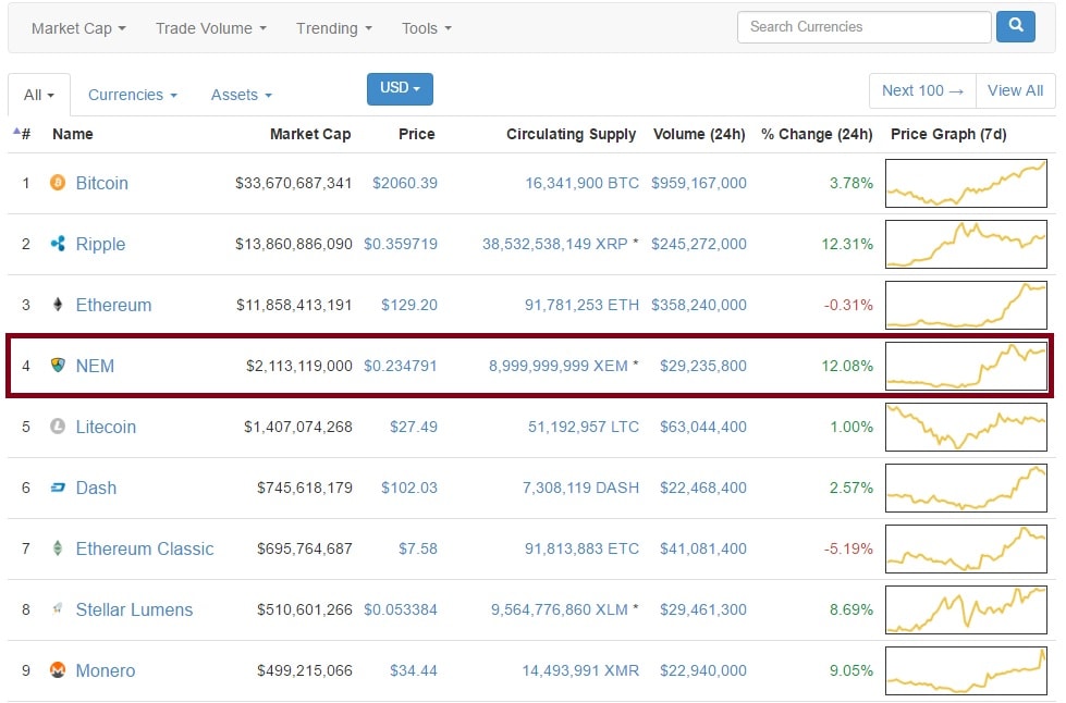 09/05/2017: A NEM demonstrou um crescimento ainda mais rápido – mais de 80%. Por capitalização de mercado, esta criptomoeda acabou por ultrapassar o DASH, o Ethereum Classic, o Monero e apenas chegou perto do Litecoin.