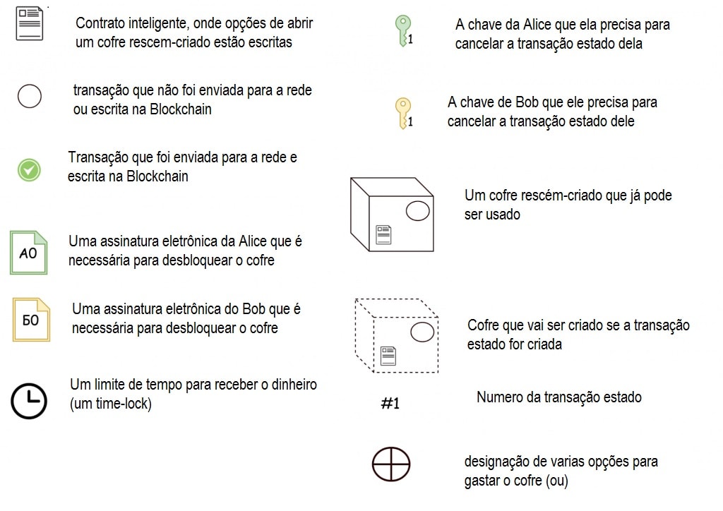 Vamos chamar uma transação que gaste dinheiro do cofre comum de “transação-estado”. Com esta transação, Alice e Bob podem recuperar seu dinheiro do cofre comum. De uma certa forma, uma transação-estado é um contrato entre dois participantes que podem executá-la a qualquer momento, enviando-a à rede dos mineradores.