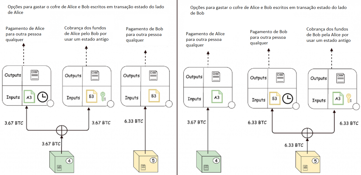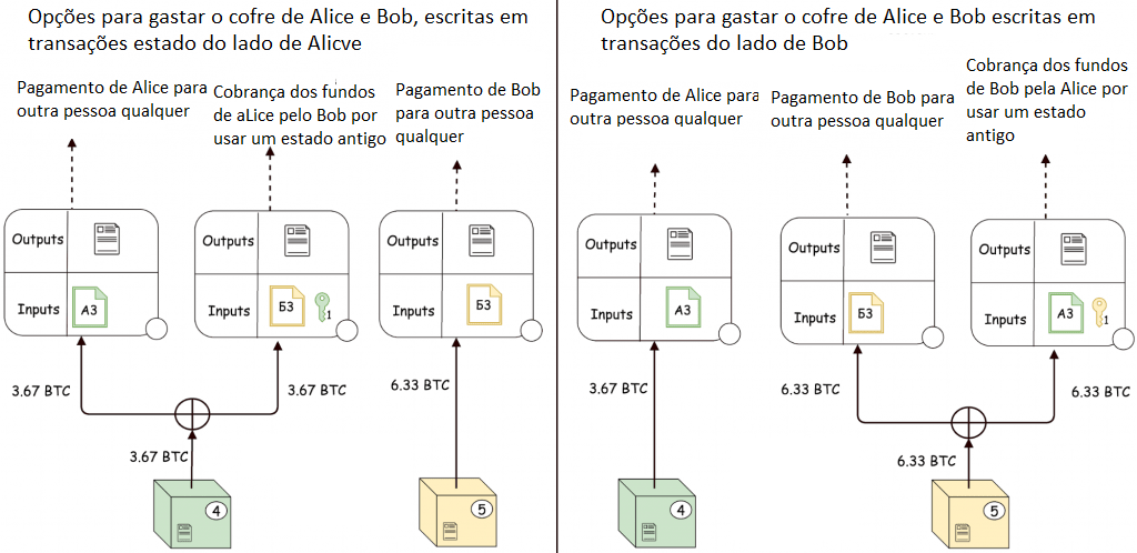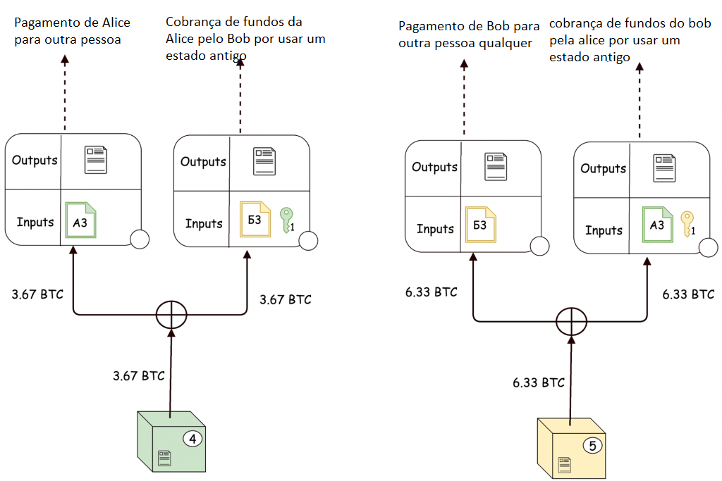 Se a Alice enviar sua antiga transação-estado agora, Bob poderá pegar tanto seu próprio dinheiro como o dela, já que a Alice deu a chave, contudo, o mesmo é válido para Bob também. Com esta configuração, nenhum dos lados terá motivação para enviar seu estado antigo à rede.