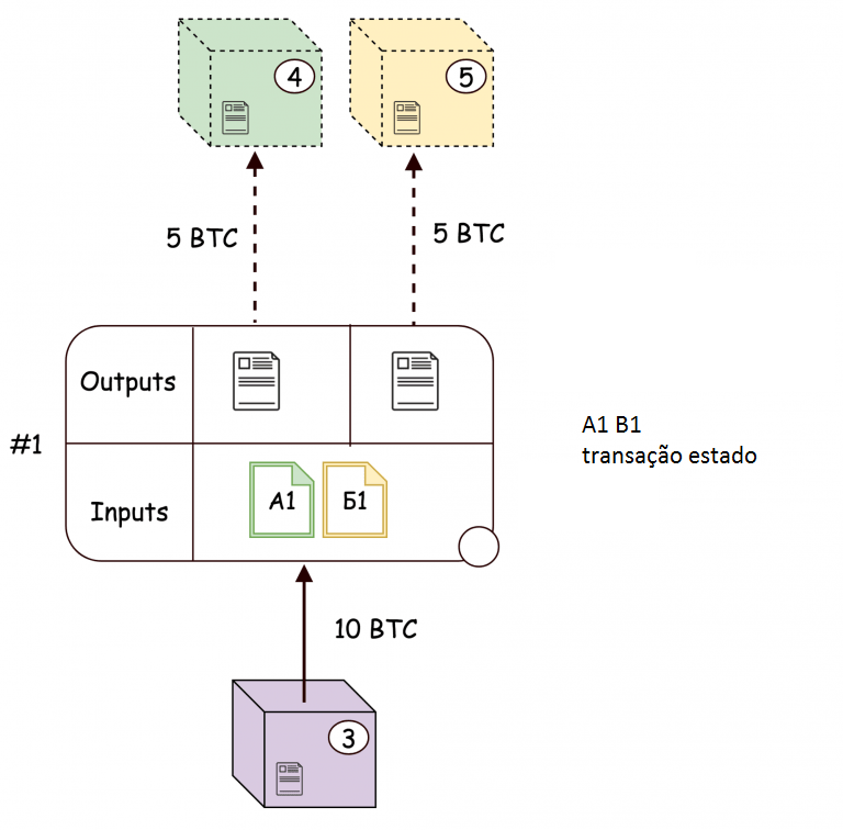Vamos definir “pagamento” como um processo de cancelamento da transação-estado antiga e criação de uma nova, onde um dos participantes obterá uma quantidade de dinheiro maior do cofre comum, em comparação com o estado anterior.