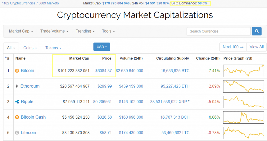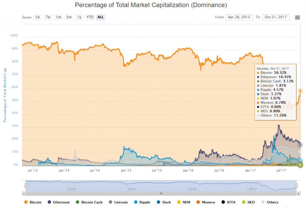 O índice de dominância do Bitcoin é de 58,3%. Isso significa que seu custo total excede a capitalização de todas as outras criptomoedas apresentadas no serviço Coinmarketcap em conjunto – atualmente existem cerca de 1181.