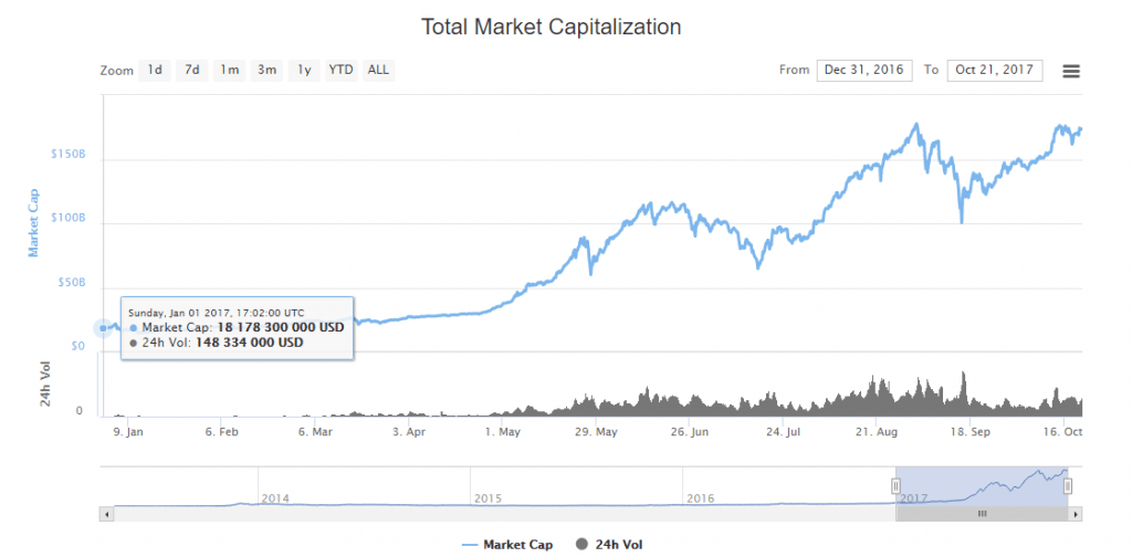 Dessa forma, se, no primeiro dia de 2017, a capitalização de mercado excedeu ligeiramente a marca de US$ 18 bilhões, então, no momento, esse valor é de US$ 173,7 bilhões. Assim, desde o início deste ano, o mercado de ativos criptográficos cresceu quase 10 vezes.