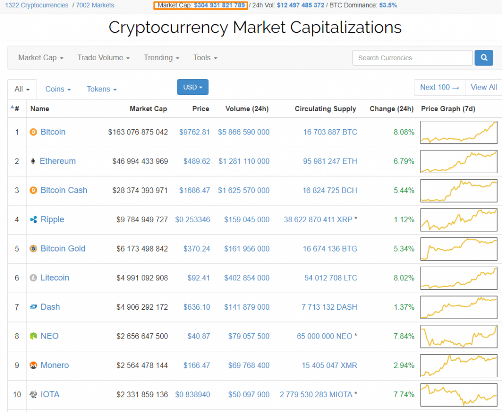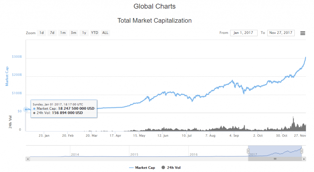 Como se pode ver na captura de tela, no primeiro dia de 2017, o valor total das moedas digitais dificilmente ultrapassava a marca de US$18 bilhões. Assim, o mercado de criptomoedas cresceu mais de 16 vezes desde o início do ano.