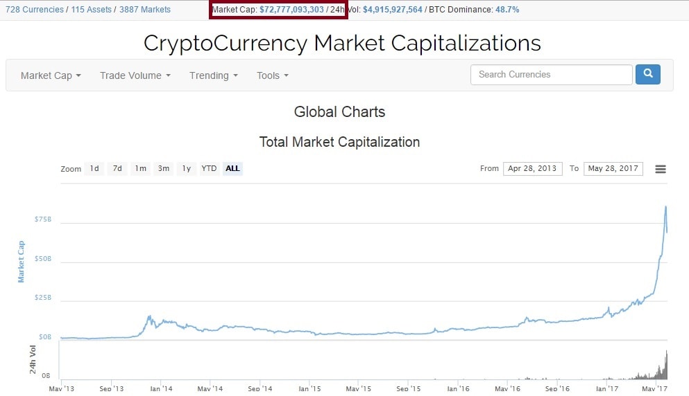 Nos últimos dois dias, o volume de capitalização de mercado das moedas digitais diminuiu em quase US$ 18 bilhões. Então, se em 24 de maio o valor total das moedas criptográficas chegou a US$ 90 bilhões, neste momento esta quantia é de US$ 72,7 bilhões.