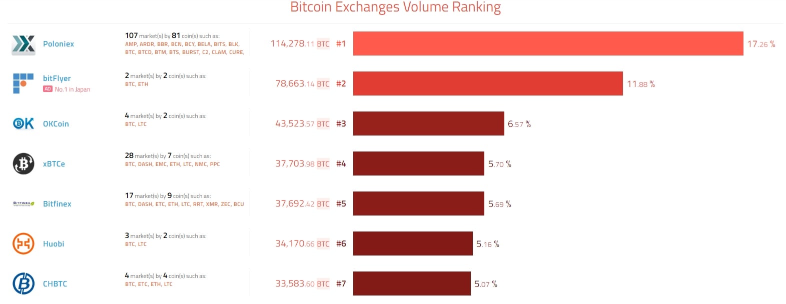 Na corretora de criptomoedas Poloniex, a Altcoin com maior volume de negociação é o Litecoin. Entre as corretoras de criptomoedas, o maior volume de negociação é na Poloniex, a líder em termos de volume de negócios, seguida pela BitFlyer e a chinesa OkCoin.