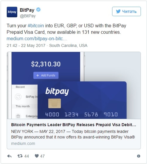Há que um ano, o serviço BitPay e Visa apresentou os cartões de débito Bitcoin, através do qual os usuários podem usar a criptomoeda para pagar compras através de terminais POS e mesmo sacar dinheiro em caixa ATMs.