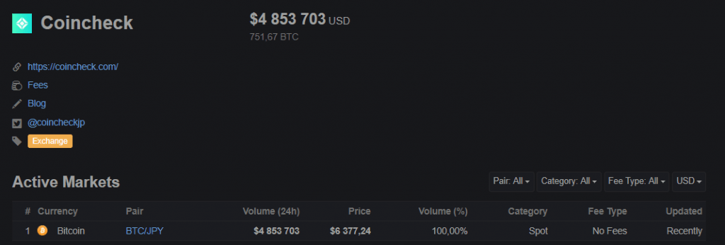 De acordo com a Coinmarketcap, o volume diário de negociação na Coincheck é de US$4,8 milhões. Vale lembrar que a plataforma oferece apenas um par de negociação: BTC/JPY.