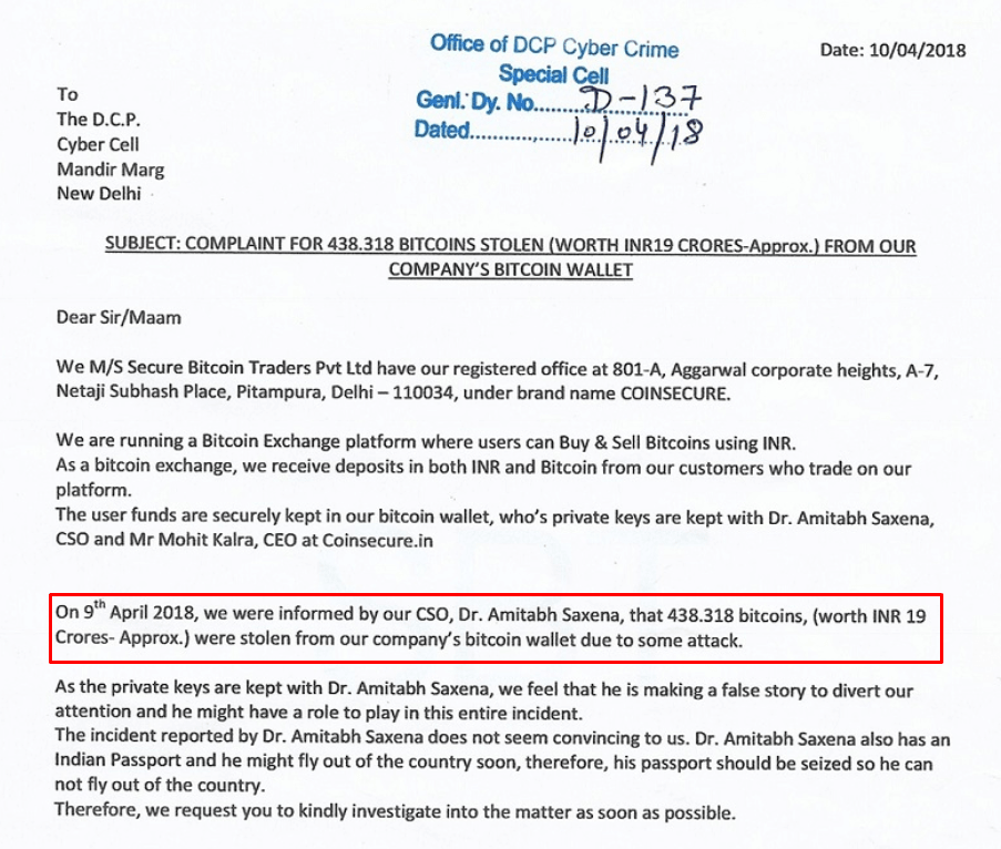 Em seu comunicado, o CEO da Coinsecure também exigiu que a polícia prenda o passaporte de Saxena porque o mesmo “em breve poderia tentar deixar o país“.