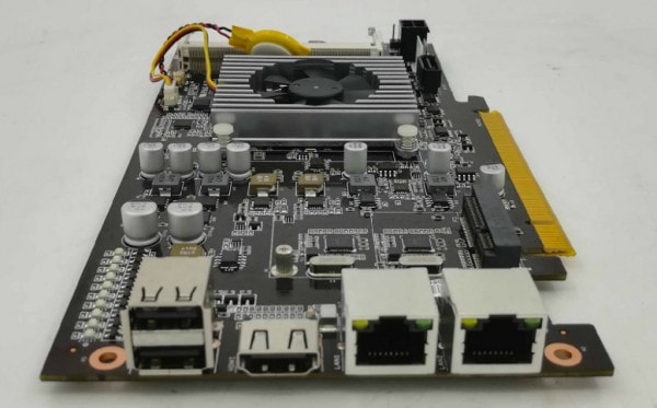 O nano slot azul é para a instalação de um cartão especial, no qual o processador Celeron J1900 está localizado, um slot DDR4 SO-DIMM, um conector mSATA de 6 Gb / s para a unidade SSD.