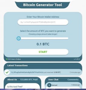 Então, cliquei no link “Ganhe Bitcoins”, e fui direcionada para um “gerador de Bitcoins”. A grande jogada desse gerador é que, uma vez “gerado” o seu Bitcoin, ele pede que você deposite um certo valor em Bitcoin para que seja paga a transferência.