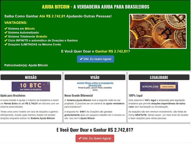 Depois disso, voltei a pagina inicial e cliquei novamente em “Ganhe Bitcoins”. Dessa vez, o site me enviou para uma pagina que me sugeria ganhar dinheiro ajudando os outros, ainda dizia assim: “ganhe dinheiro sem investir”. Gente, dinheiro não dá em árvore!