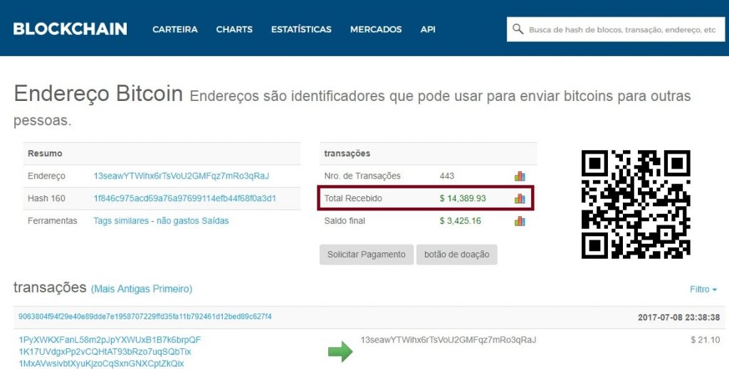 E nessa brincadeira verifiquei o numero da referida carteira de Bitcoin na blockchain.info e, para a minha surpresa, já haviam sido transferidos mais de 14 mil dólares.