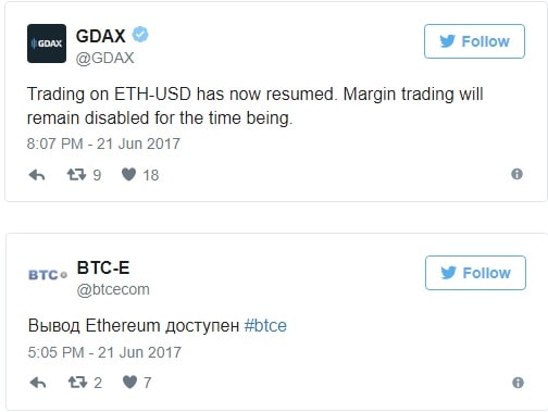 Eventos notáveis se desenrolaram na corretora GDAX, onde o preço do Ethereum, em algum ponto, desmoronou para US$ 0,10. No momento, a exchange está investigando o incidente. Os depósitos e as retiradas de fundos também foram suspensos há algum tempo, no entanto, há algumas horas, a GDAX informou que havia retomado sua operação normal. A negociação de margem, no entanto, ainda não está disponível.
