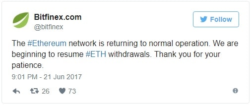 A Bolsa de Hong Kong, Bitfinex suspendeu a retirada da ETH depois que os atrasos na confirmação das transações na rede Ethereum começaram a ser observados, estes claramente causados pela corrida em torno do crowdsdale da startup de blockchain Status.