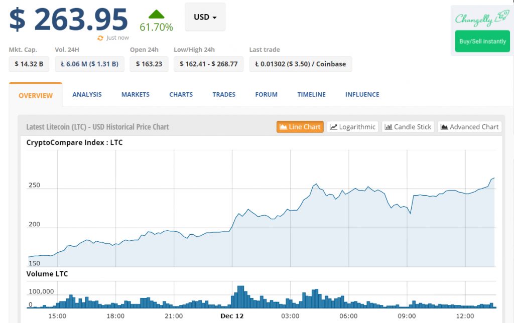 Escalando perto de US$200 na noite de segunda-feira, na noite de terça-feira, dia 12 de dezembro, o Litecoin não apenas superou esta barreira psicológica, mas foi mais longe, superando a marca de US$265.