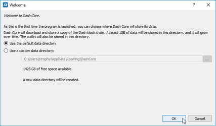 Uma vez que a instalação esteja completa, o Dash Core será iniciado imediatamente. Caso contrário, clique em Iniciar > Dash Core > Dash Core para iniciar o aplicativo. Na primeira vez que o programa for iniciado, você receberá uma escolha de onde deseja armazenar seus dados de cadastro e carteira. Escolha um local com espaço livre suficiente, já que a cadeia de blocos pode chegar a aproximadamente 3-4 GB de tamanho. Recomenda-se usar a pasta de dados padrão, se possível.