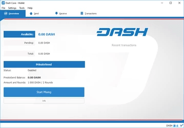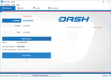 Uma vez que o Dash Core for instalado e iniciado com sucesso, você verá a tela de visão geral da carteira. Será possível notar que a carteira está “fora de sincronia”, sendo que a barra de status na parte inferior da janela mostrará o progresso da sincronização.