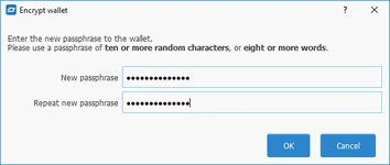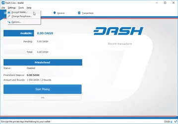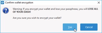 Após a sincronização da carteira com a rede Dash, é aconselhável criptografá-la com uma senha ou pin para impedir o acesso não autorizado. Você deve usar uma senha forte e nova que nunca usou em outro lugar. Anote sua senha e guarde-a em algum lugar seguro ou você será bloqueado fora de sua carteira e perderá o acesso aos seus fundos.