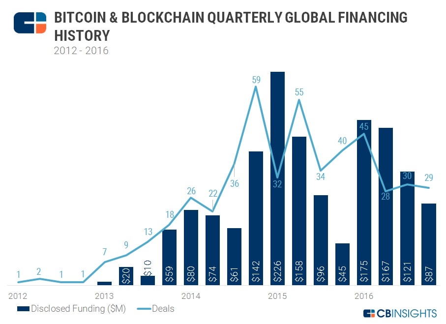 Nos primeiros três meses de 2017, os investimentos em startups de Bitcoin totalizaram cerca de US$ 120 milhões, sendo distribuídos neste período para 21 negócios.