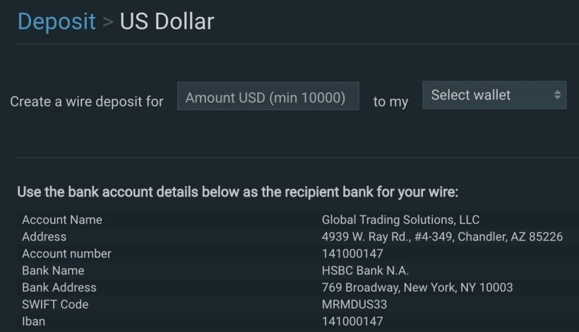 Aos usuários da plataforma é oferecida a possibilidade de para fazer depósitos em dólares em uma conta privada da Global Trading Solution, LLC. Adicionalmente, o banco beneficiário indicado é a divisão americana HSBC Bank N.A.
