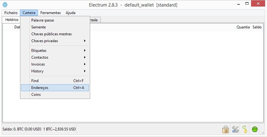 Passo N.º 1: Com a Electrum Wallet aberta e desbloqueada, vá até “Carteira” no menu superior e clique em “Endereços”.