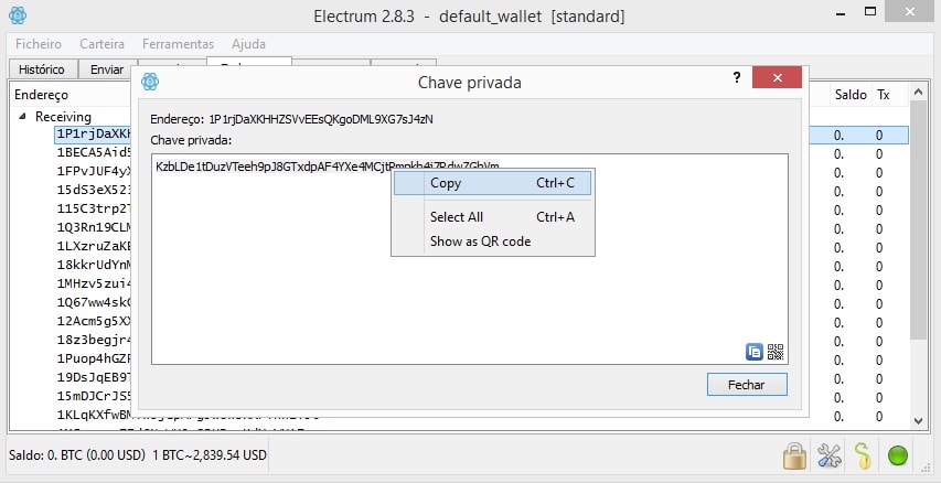 2.ª: Utilizar a Private Key dos endereços com saldo: Uma maneira mais segura importar seus BCC na outra carteira seria importar apenas as Private Keys dos endereços que continham valores no momento do Fork. Desta maneira você não irá expor mais endereços do que o necessário no processo. Para fazer isso, clique com o botão direito do mouse sobre o endereço desejado e selecione a opção “Chave privada”.