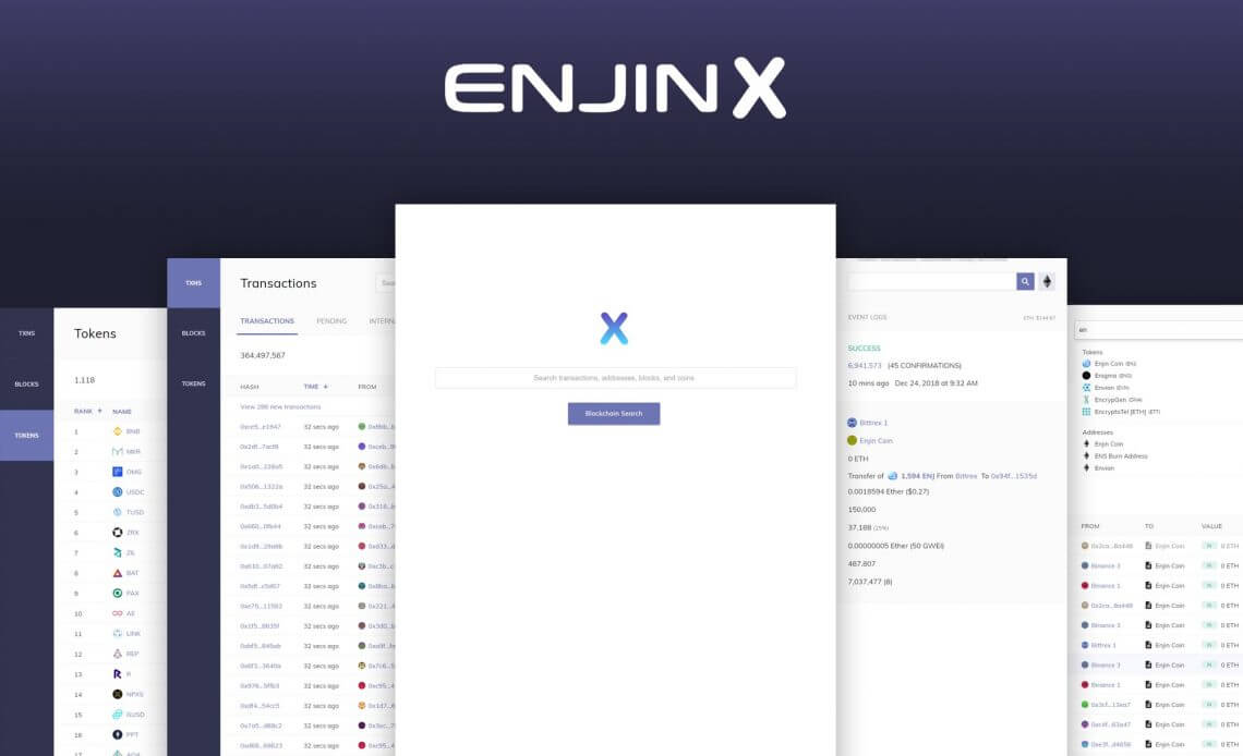 O EnjinX é um aplicativo moderno, rápido e responsivo de web voltado à exploração de tokens e dados da Blockchain do Ethereum . Em 2019, após adicionar os itens descritos acima, ele será o primeiro explorador Blockchain universal de todos os tempos, agregando os dados de várias Blockchains em apenas uma solução.