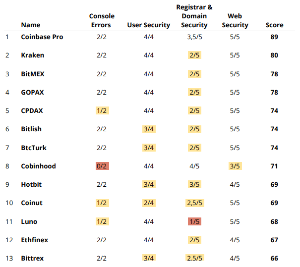 A Coinbase Pro é o líder da classificação, com uma pontuação de segurança agregada de 89.