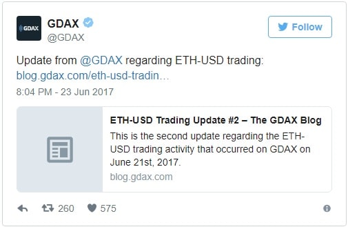 A corretora de criptomoedas GDAX comprometeu-se a reembolsar as perdas financeiras dos investidores envolvidos em negociação de margem sofreram como resultado de uma falha na rede Ethereum em 21 de junho. A declaração correspondente foi publicada no blog oficial da GDAX.