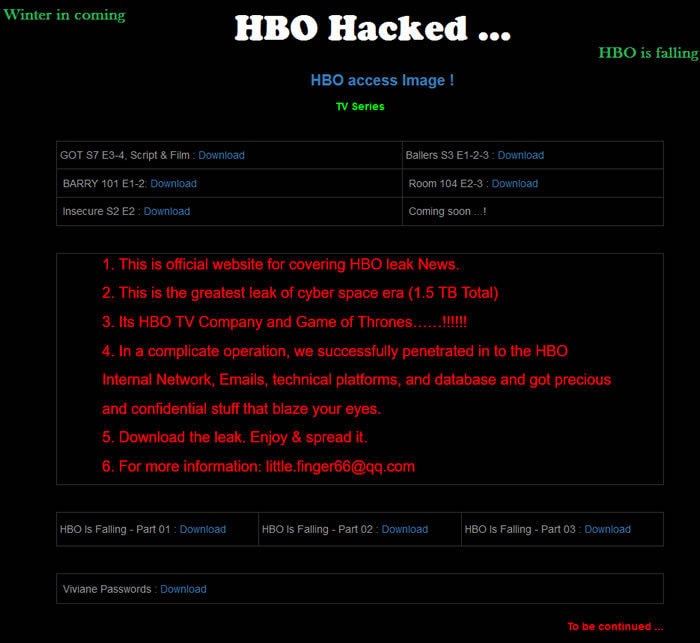 Entre os arquivos roubados estão todos os epísodios da nova temporada de “Game of Thrones” e algo em torno de 1 mês de mensagens do e-mail do vice-presidente da HBO Film Leslie Cohen.