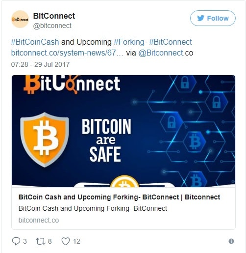 É por esta razão que algumas plataformas, incluindo o Bitfinex, pretendem adicionar o Bitcoin Cash sob o ticker do BCH e a equipe do BitConnect distribuiu uma declaração em que chama a atenção da comunidade para esse detalhe, exortando os usuários a serem extremamente cuidadosos.