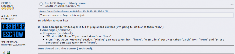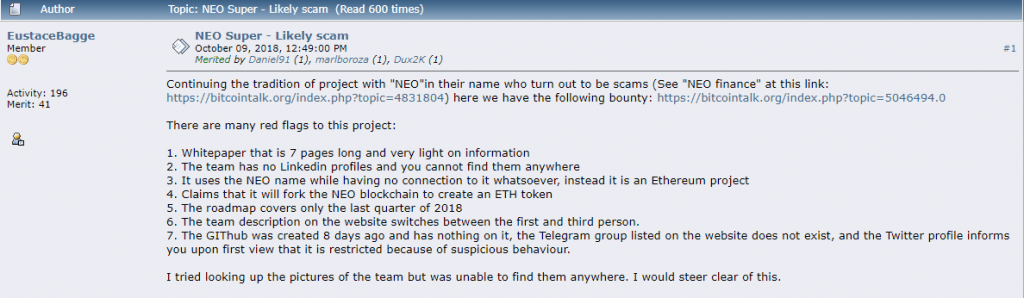 No dia 9 de outubro, um post foi publicado no fórum Bitcointalk.org afirmando que o NEO Super poderia ser um projeto fraudulento.