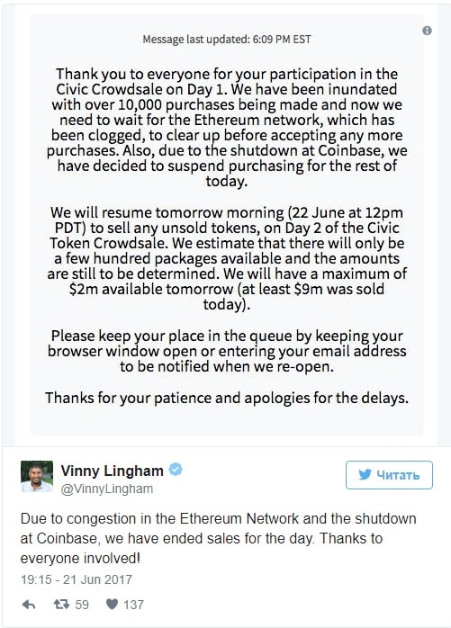 Porem, os problemas que surgiram na plataforma da rede Ethereum no dia anterior e na plataforma da Coinbase obrigaram a equipe do projeto a rever seus planos. Dentro desse contexto, com as plataformas em colapso, o CEO da Civic, Vinnie Lingham publicou em seu twiter uma mensagem falando sobre a suspensão forçada da crowdsale:
