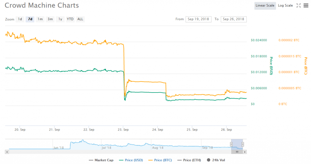 A carteira Crowd Machine foi comprometida no sábado, dia 22 de setembro, contudo, o primeiro relatório sobre isso apareceu no blog do projeto somente na segunda-feira. De acordo com a Etherscan, os criminosos cibernéticos conseguiram retirar mais de 1 bilhão de Crowd Machine Compute Tokens (CMCT). Em meio a esse incidente, o preço do token caiu em 87% durante um dia (23 de setembro), parando em torno de US$0,0019. No momento, o custo de um token é de US$0,002698.