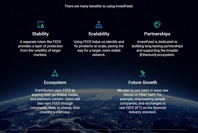 Para conseguir isso, a empresa investFeed Inc. está fazendo uma crowdsale de seus tokens FEED (IFT), os quais serão ativamente utilizados para recompensar e movimentar valores dentro de sua plataforma diversificada.