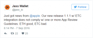 Tweets de Jaxx dizem que a Apple rejeitou seu pedido para integrar Ethereum clássico ETC na sua carteira no iOS App Store, mas não especificou o motivo.